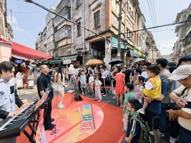 5月4日的“墟街有戏•流金岁月音乐会”,更是将舞台延伸至象征江门起源的墟顶三十三阶梯前。在《彩云追月》器乐独奏的清韵中,《红日》《月亮代表我的心》《朋友》《再回首》《我的未来不是梦》等20世纪70-80年代流行金曲次第响起,不同年龄阶段的观众在此达成情感共鸣,活动高潮时更是引发全场大合唱。现场歌声、掌声、喝彩声不断响起,汇成了欢乐的海洋。