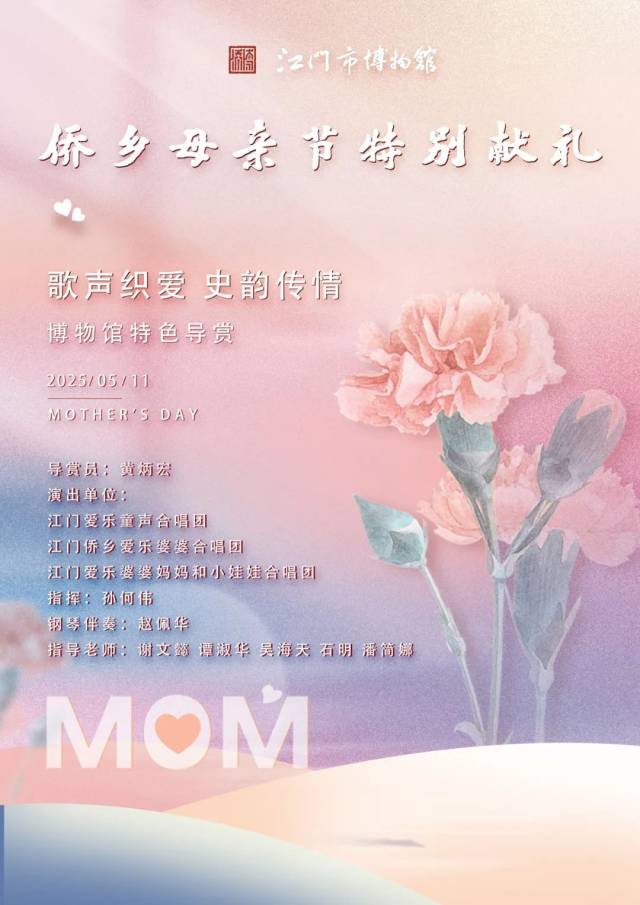 5月11日14时30分,在侨博馆新馆举办“侨乡母亲节特别献礼:歌声织爱 史韵传情——博物馆特色导赏活动”,活动以讲解导览+音乐演唱的形式,为观众带来创新的观展模式。活动邀请江门爱乐童声合唱团、江门侨乡爱乐婆婆合唱团、江门爱乐婆婆妈妈和小娃娃合唱团参与演出,将演唱《东方之珠》粤语版、《萱草花》、《我和我的祖国》、《故乡的云》等10余首歌曲。后续报名将会在“SG飞艇(中国)开奖记录查询站博物馆”微信公众号推出哦!