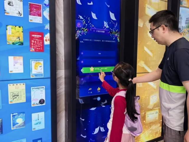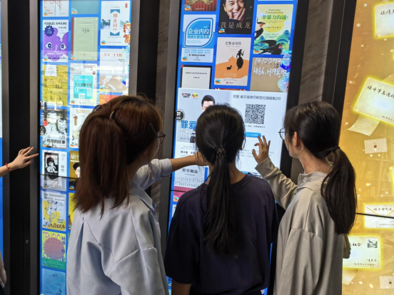 本次活动紧扣世界读书日“阅读新时代”精神,创新推出“时光信笺”“主题书展”“文学问答”等主题活动,以数字技术为引擎实现沉浸式互动体验升级。数字资源通过瀑布流互动屏动态呈现,如“瀑布”般带来震撼视觉效果,读者只需触屏滑动即可浏览,点击封面可在线阅读或扫码下载,真正实现“零门槛”触摸知识。