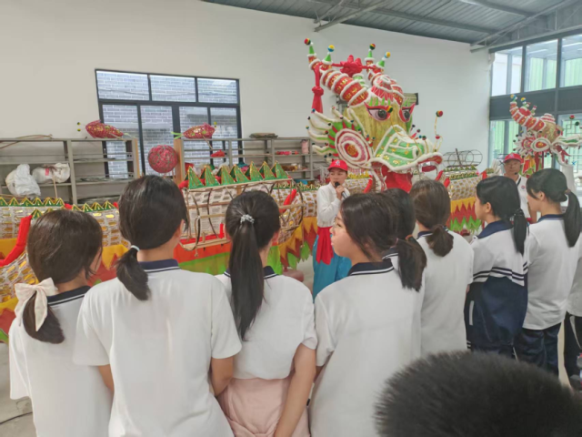 在非遗传承人的带领下,学生们围坐在古色古香的纱龙工坊里,透过老师傅的讲解,大家揭开了这条 “巨龙” 的“竹骨纱身”的工艺之美。当得知这条纱龙24 节龙身的每一个关节都要做到“摇头摆尾皆有韵 ”,在夜间舞动时会通体透亮、鳞光闪烁,孩子们的惊叹声中又多了几分对传统匠艺的敬畏,纷纷发出 “原来非遗技艺全在细节里” 的感慨。