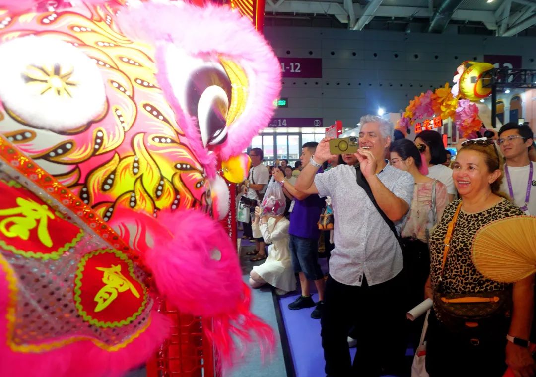 开幕日当天,江门展位的演出节目精彩纷呈,为展会增添了浓厚的文化氛围。气势磅礴的蔡李佛醒狮表演,赢得了现场观众的阵阵掌声,受到众多外籍客商的喜爱。来自哥伦比亚的Raul一边观看蔡李佛醒狮表演,一边用手机拍照录像。Raul表示,醒狮表演很精彩,他喜欢江门。来自俄罗斯的Victoria同样对蔡李佛醒狮很感兴趣,只见她将手机摄像头对准跃动的醒狮,记录醒狮的灵动身姿。Victoria表示,她知道醒狮是中国的传统文化,看到这么精彩有趣的表演,她觉得很激动。