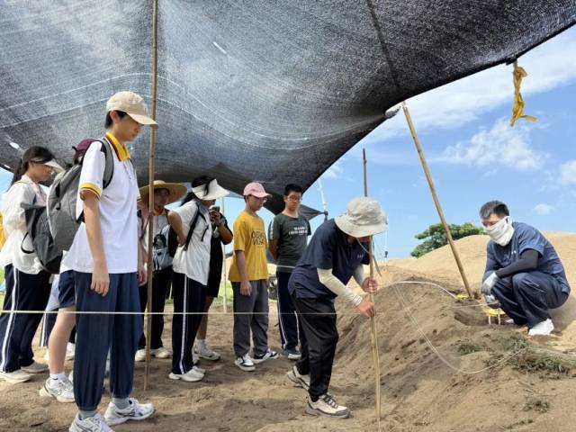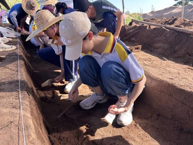 考古布方与发掘考验着同学们的耐力与体力!同学们在考古布方实践中,亲手拉线、定点、打下铁钉,在遗址上划分出属于自己的“探沟”。随后,考古发掘实践将专注力提升到极致,观察探沟地层,画出地层线,手持小巧的手铲、毛刷,在老师们的指导下屏息凝神地进行精细化清理。“当我清理陶片时感到无比的兴奋与自豪,这不仅是一块陶片,还是千年前的信息,是无数劳动人民的智慧结晶,是源远流长的中华文明的一部分。”江门一中的关炜琦同学感叹道。