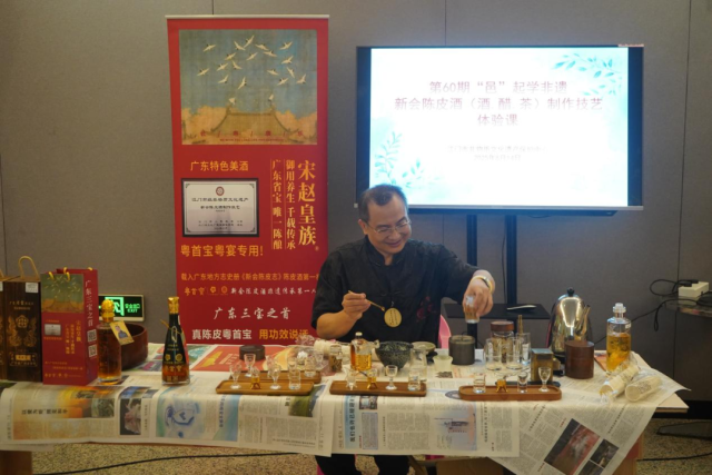 活动现场,非遗传承人赵卫国化身“匠心导师”,以精湛的技艺为学员们揭开新会陈皮酒(酒・醋・茶)制作技艺的神秘面纱。在制作陈皮醋环节,赵卫国老师的每一个动作都如行云流水般娴熟。他先将珍贵的 35 年生普茶与 5 克10年的陈皮丝轻轻置于碗中,那散发着岁月气息的茶叶与陈皮丝,仿佛在诉说着时光的故事。随后,白酒缓缓倒入,浸润着茶叶与陈皮,为这场味觉盛宴奠定基础。令人惊叹的是,赵卫国老师竟用打火机点燃混合物,火焰瞬间升腾,在碗中肆意舞动,他轻轻地搅拌着,火光映照下,尽显匠人风范。片刻后,迅速加盖,并在盖上加热水,让热水缓缓流入,浸润着碗中的陈皮和茶叶。在这一系列看似简单却暗藏巧思的操作后,一碗色泽诱人、香气扑鼻的陈皮醋茶新鲜出炉。