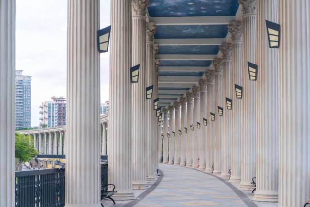 新桥中心路的美真的可以跨越时间和空间,从万景楼到新桥市民广场,从国风审美到欧式美学,只需一瞬。还未走进,就能看到恢弘亮丽的欧式广场,漫步罗马柱组成的长廊,抬头是美轮美奂的星座穹顶,还有洁白拱门、许愿池、十二星座守护神……好像在度过一次罗马假日。