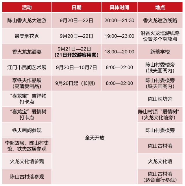9月20日至22日每晚八点,百米火龙将在龙门里最古老的三世祖仲华李公祠(今新蕾学校)举行“起龙”仪式,数以百计的村民为火龙“上龙香”“点龙睛”,借沾龙气祈福。