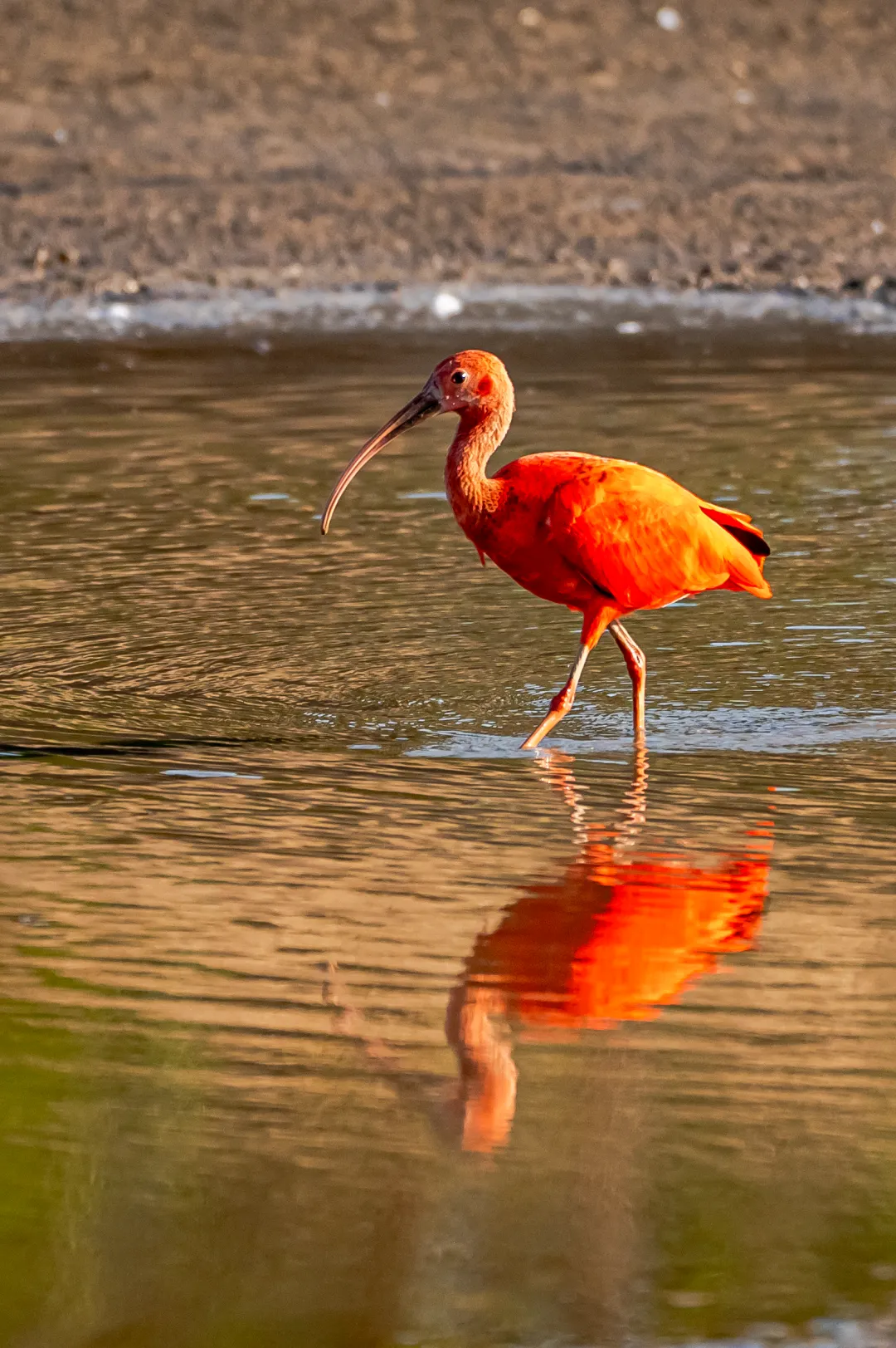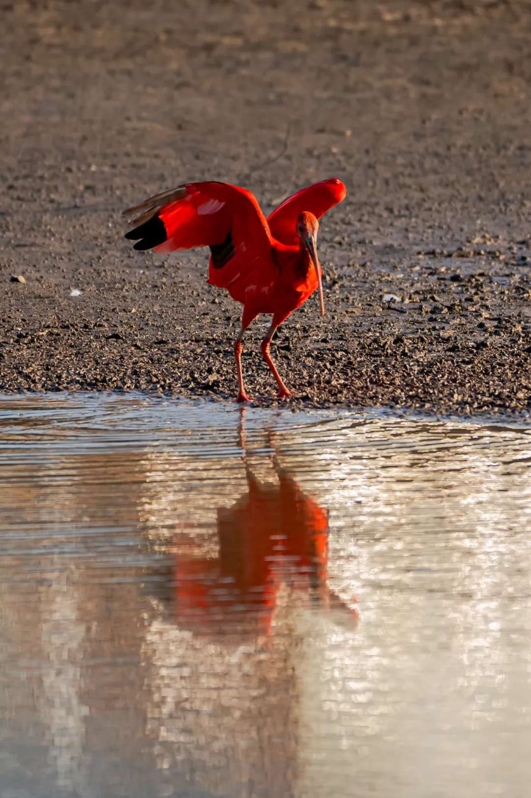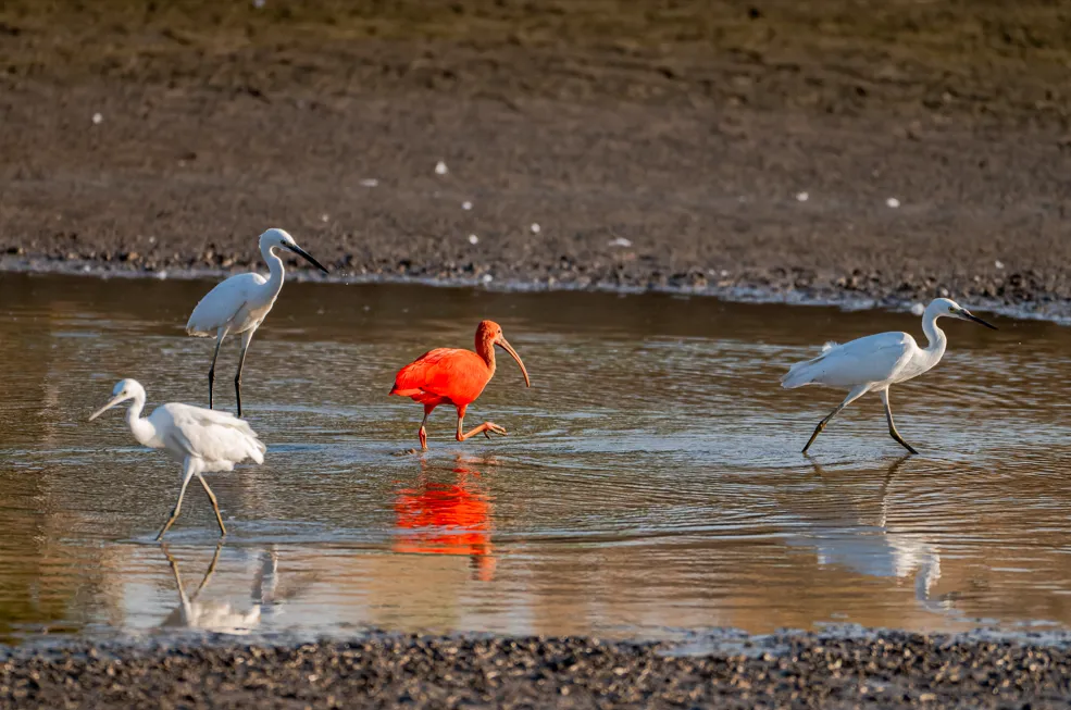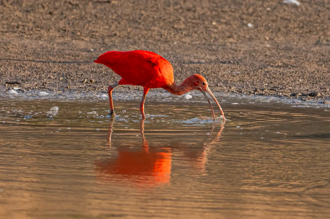 记者在浅滩见到了一只红色的大鸟,