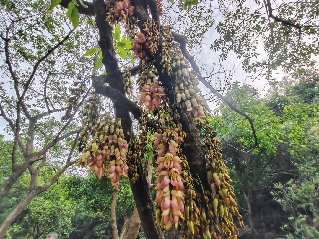 粉红禾雀花,学名美叶油麻藤,是大雁山特有的野生品种。这棵禾雀花藤龄己有50多年,从清沽潭边一处岩缝开始蔓延,藤茎苍虬犹若巨蟒,游走攀爬于山石树林之间,生长覆盖面积已有50多亩。它的花形奇特,神似一只娇小可爱的禾雀,头、嘴、翼、尾一应倶全,惟妙惟肖,神形兼备。花色白里透红,犹如少女初妆、娇艳欲滴。