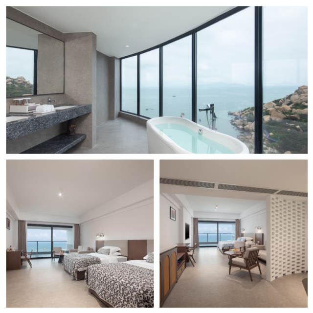 205间智能生态客房,全景落地窗180°无界视野,16层临海建筑将那琴半岛地质海洋公园旖旎风光尽收眼底,犹如山海入室。客房设计以“倚岸、观澜、星海、蜜月……”等为主题,晨观海上日出,夜揽星河入梦。