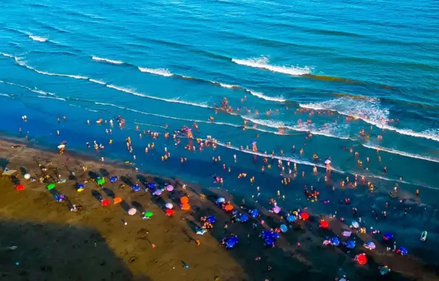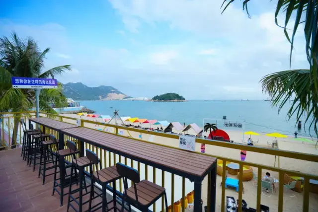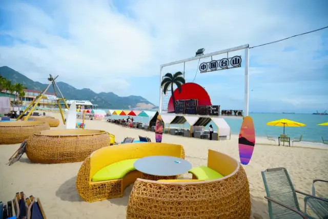 一旁伫立着整排彩色遮阳伞和沙发椅,
