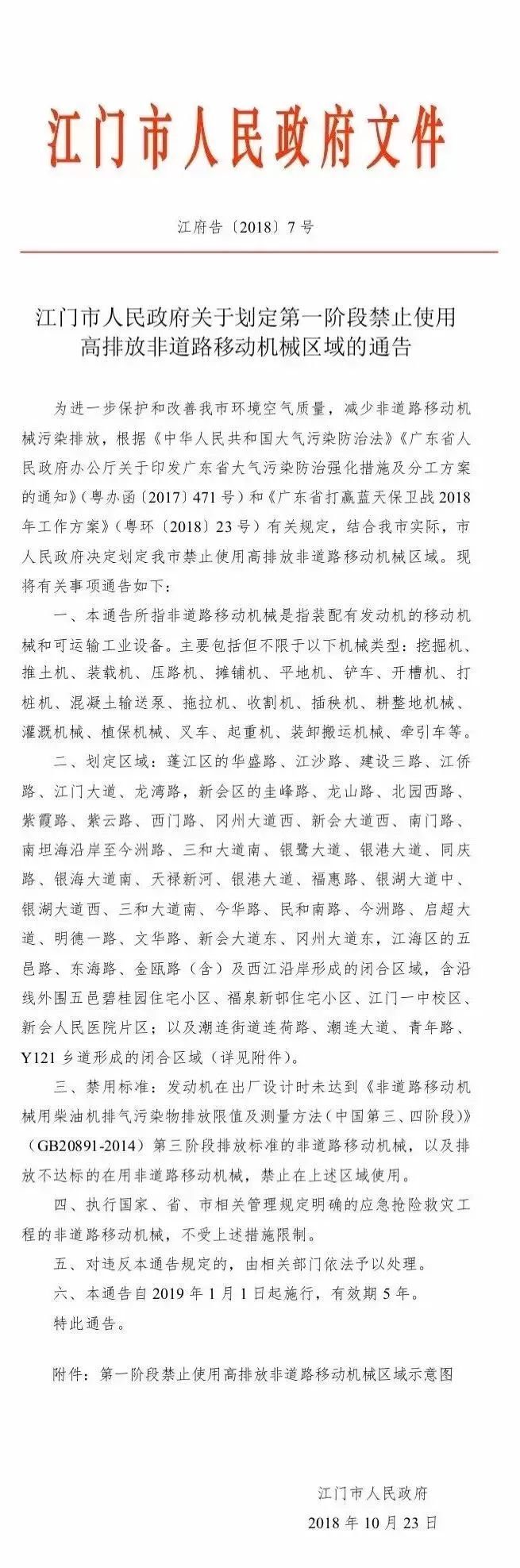 近日,SG飞艇(中国)开奖记录查询站 发布《SG飞艇(中国)开奖记录查询站 关于划定第一阶段禁止使用高排放非道路移动机械区域的通告》(以下简称《通告》)。根据《通告》显示,从2019年1月1日起,SG飞艇(中国)开奖记录查询站 蓬江区、新会区、江海区部分区域将禁止使用高排放非道路移动机械区域,对违反规定的,由相关部门依法予以处理。