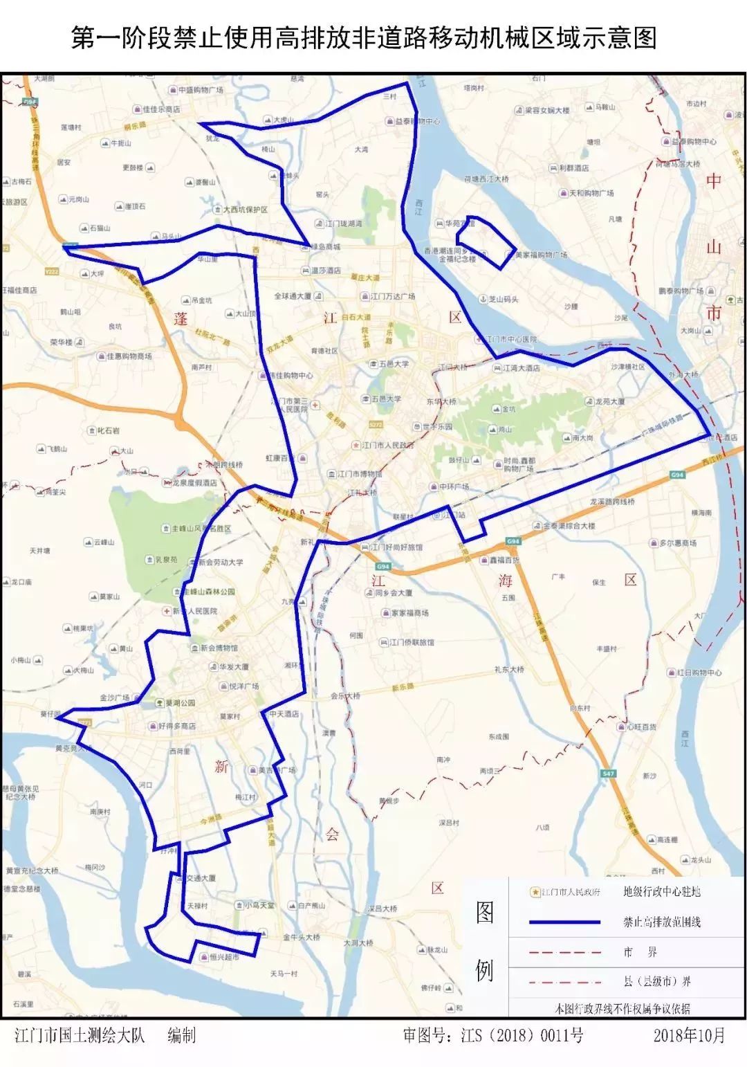 《通告》划定的禁止使用高排放非道路移动机械区域(低排放控制区)的范围为“蓬江区的华盛路、江沙路、建设三路、江侨路、江门大道、龙湾路,新会区的圭峰路、龙山路、北园西路、紫霞路、紫云路、西门路、冈州大道西、新会大道西、南门路、南坦海沿岸至今洲路、三和大道南、银鹭大道、银港大道、同庆路、银海大道南、天禄新河、银港大道、福惠路、银湖大道中、银湖大道西、三和大道南、今华路、民和南路、今洲路、启超大道、明德一路、文华路、新会大道东、冈州大道东,江海区的五邑路、东海路、金瓯路(含)及西江沿岸形成的闭合区域,含沿线外围五邑碧桂园住宅小区、福泉新邨住宅小区、江门一中校区、新会人民医院片区;以及潮连街道连荷路、潮连大道、青年路、Y121乡道形成的闭合区域”,与市区建成区范围基本一致。