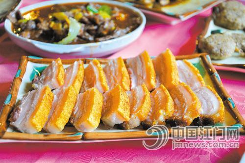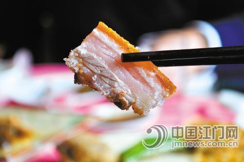 我们入座之后,笔者的一位朋友也是“吃货”,他叫来一名服务员,特别点了这家餐厅的几道招牌菜,其中包括脆皮烧鹅和卤水拼盘。说实话,虽然和记餐厅在江门来说很有名气,但之前笔者并没有帮衬过这家餐厅。“烧鹅来了。”入座不久,服务员为我们端上一盘烧鹅,烧鹅刚上桌,其散发出来的浓郁肉香味,已令人垂涎欲滴,食指大动。看见这道还泛着油光的烧鹅,笔者一下子忘记了自己的仪态,抢先夹了一块烧鹅放入口中吃了起来,发觉鹅皮酥脆、鹅肉嫩滑,肥而不腻,十分不错。用来配合烧鹅的酱料香味浓郁,拌在饭里,味香色靓,让人忍不住多吃几口。