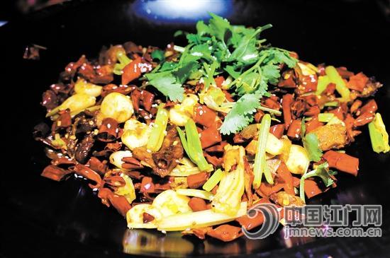 香锅带皮小黄牛肉,是一道越吃越辣、越辣越过瘾的美食。服务员在把菜式端上来之前,会在香锅的底下放一个小小的火炉进行保温。随着温度慢慢升高,香辣的气味从锅里散发出来,让你光闻着就口水直流。带皮小黄牛肉是一种十分适合用锅来煎炒的食材,有嚼劲的口感能够让味道停留的时间更长。刺激的香辣完全渗入牛肉中,让你的舌头都变得香辣起来。
