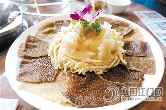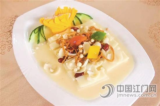 就如这个芝士淮山,一看名字就知道是中西结合的菜式。把淮山灼熟后切成薄片,然后用芝士熬成汁,再配上一些百合和虫草即可上盘,好看之余又让人觉得新奇。把淮山片沾着滑嫩的芝士汁一起送进口中,淮山清脆爽滑的口感,正好冲掉芝士的甜腻,让人满心欢喜。