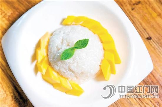 这里的芒果椰汁糯米饭,俘虏了不少女生。厨师把泰国象牙芒果切成小块,再将奶白的椰汁淋到糯米饭上面,简简单单的做法,就成就了这道外表靓丽的菜式。软糯的饭散发着芒果和椰汁的清香,一口芒果,一口糯米饭,让你的唇齿留香。