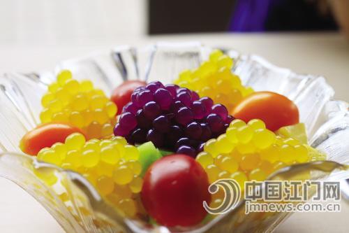 豆腐捞一上场,我便毫无抵抗能力。五彩缤纷的造型让我实在心动。我选的是紫薯豆腐冰,它是用鮮奶、紫薯、芝麻、杏仁和麦草5种原料提炼而成,急速冷冻后,外观看似豆腐,轻咬一口,香软顺滑,口感甚好,比中国豆腐花稍结实,爱吃杂粮的女士肯定为之倾倒。豆腐上层铺着新鲜的芒果肉、菠萝肉、奇异果肉和可爱的西红柿。最为神秘的要数顶上的一粒粒“彩珠”,一口下去,“嘣”的一声,彩珠爆开,果汁流出,清甜无比,少许刺激之余口感十足,店长说这就是他们的秘密武器——鲜果爆蛋。