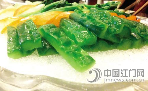 首先上桌的,是“蚝豉黄豆凉瓜汤”,用酸菜、排骨、黄豆和凉瓜一起煲成的老火汤,微苦带酸,不肥不腻,甘香润喉,清楚了食道的阻滞,好一道开胃菜。主打菜式亦是我最着迷的“冰镇凉瓜”,把凉瓜洗净去心,切成两寸见方的凉瓜片,放入开水里灼一分钟,过冰水,将凉瓜在冰盘上排列整齐。一口咬下,冰凉透心,咀嚼无渣,充分突出凉瓜的过人之处。惹味汁浓的“鱼骨焖凉瓜”,凉瓜的苦味被鱼骨吸去,变得甘香可口;“白灼凉瓜”是将凉瓜切片白灼,蘸着砂糖吃,凉瓜碧如翡翠,入口时略带苦涩,和着砂糖的清甜后,苦味即化为甘润。还有“酥炸凉瓜”、“凉瓜炒牛肉”、“杜阮凉瓜煎蛋角”……一席凉瓜宴摆上来,满桌尽是养眼的翠绿,还有主食“凉瓜饼”、“凉瓜粥”,饭后甜品“凉瓜汤圆”,让我这个地地道道的江门本地人也为之倾倒。