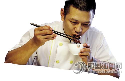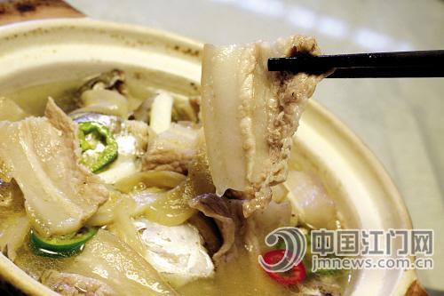 同样是煲,一款“清煲”彻底俘虏了我的心。“白瓜”是阳江特有的瓜种,农妇们一般将其切条腌制,咸脆香的它配粥吃一流,大伙都叫它“瓜咸”。在我看来有点像“萝卜仔”,但味道就清香很多,不上火是关键。乍眼一看,卖相没有豆鼓扣腩肉那么“野”,但“素色”的它却是“禾秆盖珍珠”。豹哥先用50-60℃的水把五花肉浸煮片刻,再放入冰鲜鲳鱼提鲜,再配以瓜咸调味,焖片刻。看似很家常的一道菜却被团友们一扫而光。五花肉片入口韧中带脆,肥肉毫无膻味,猪肉味很浓之余每咬一口都有种甘香。“用四大家鱼中的一种不是更新鲜吗?”“冰鲜鲳鱼更为鲜美,有种得天独厚的海洋气息,最适合提鲜,这样才够‘阳江风’。”豹哥说,“不要浪费那些汤汁啊,试着配合生滚粥吃。”大伙似乎没人动工,我便做了回“白老鼠”,我勺了点汤汁混在白粥里,“好鲜甜啊!”刚才是肉香抢味,现在是鱼香突出。大伙看到我埋头一个劲在吃,纷纷抢着尝鲜。