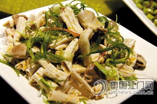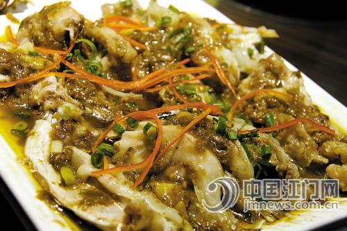 这是一款让人吃了停不了口的菜肴。鹅肾带切成2厘米长,一口下去清爽中夹杂着麻油的清香,胡椒与麻油一拍即合。黄国治笑道:“阿栋对炮制酱料有一手,过去这款凉拌鹅肾带虽受欢迎,但总觉得不够刺激。经过吕维栋秘制酱料搅拌后,鹅肾带咬起来爽脆有嚼头,麻香之余有鹅的香味,不再是过去那样只有香料的味道。麻辣只停留在舌尖,但香味则充斥着喉咙,非常过瘾。”