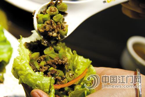 榄菜炒青豆是较为家常的一道菜式。如何让其与鹅相关联,吕维栋又来创意。在其中放入鹅肝,炒的时候拌入适量鹅油。一上桌,青豆粒蠢蠢欲动般,似乎想跳进食客的嘴里。榄菜放得不多,起到提味的作用,但完全没有盖住青豆的清甜。每嚼一口都有鹅肉的香味,不见鹅肉却吃到鹅味,太有意思了。黄国治特意配上生菜叶,像韩国的卷肉一样,生菜清甜,肉末浓香,下饭一流!
