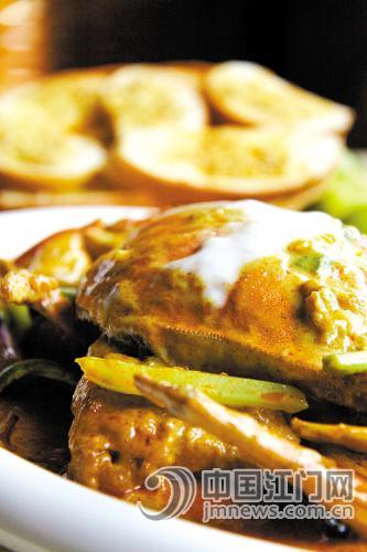 泰国咖喱分青咖喱、黄咖喱、红咖喱等多个种类,其中青咖哩最辣,味道最浓,泰国人最爱。在江门的五邑蕉叶泰国风味餐厅,大厨“泰国伟”为了照顾外来游客的口味,特意加入了椰酱来减低辣味和增强香味,而额外加入的香茅、鱼露、月桂叶等香料,更令泰国咖喱独具一格。配合秘制的青咖喱,色泽鲜亮、味道浓郁,给食客舌尖上的享受,其中咖喱面包蟹是这里的王牌。