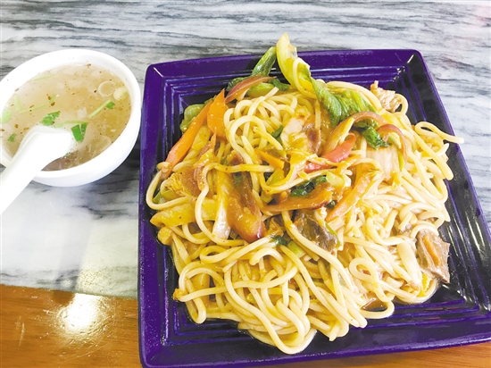 当厨师把煮好的面与肉丝、肉片、胡萝卜、洋葱、辣椒、青菜等材料混炒时,你就能闻到厨房传来的阵阵香味,香喷喷的面出锅后用盘子乘上桌,满满一盘也显出了西北人的豪迈。“青海炒面片,让我感受到了家的味道。”记者的同事小李说,她就是青海人,想吃面的时候总会来这里。
