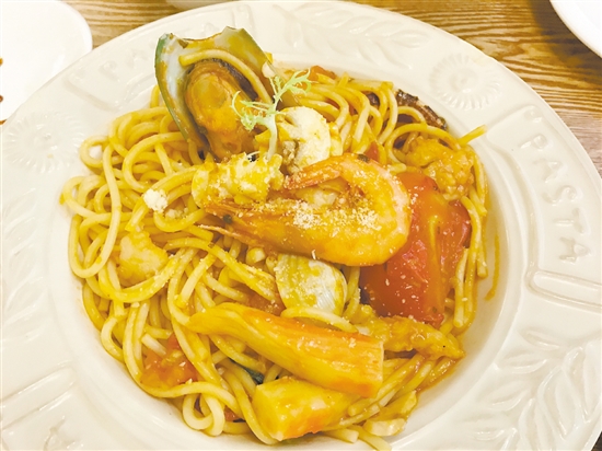 特别推荐罗勒鲜茄海鲜烩意大利面,用料足,大虾、蟹肉、贝类、虾仁、鱿鱼等很丰富,基础酱汁是红酱,也就是我们所说的番茄酱,还加入了香味独特且浓郁的罗勒酱,整份意大利面的味道非常有层次感,吃完满满都是幸福感。