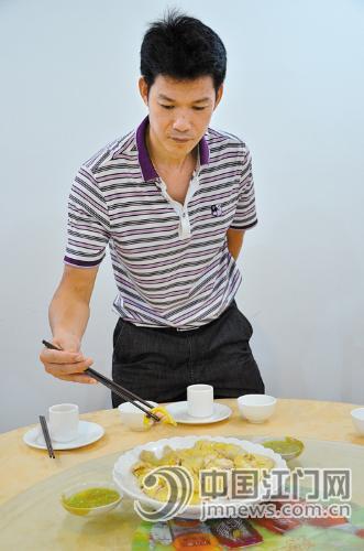 新会淘米粥美食城老板杨华钦在检查出品。
