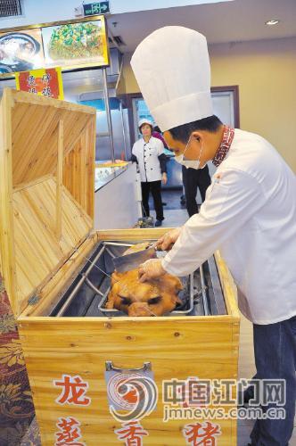 走新侨大酒楼,评审团成员就被一种木制的笼子所吸引。笼子里放置着一头蒸好的猪。有食客需要,大厨林金来就切一小块给他们。