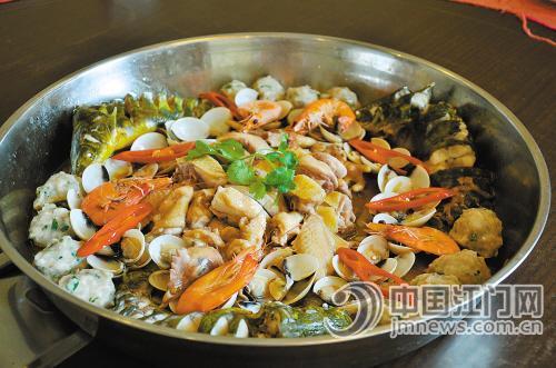 盛这道菜的盘子很大,直径有45厘米,盛上特色海鲜拼盘后,很重。唐先生用手掂量了一下,约有3公斤重。“这么大的分量,足够五、六个人吃。”唐先生吃了几口,接着赞叹说:“这道菜将白贝鲜、黄骨甜、鸡肉香融汇在一起,吃起来嫩滑鲜美,原汁原味,难得难得。”