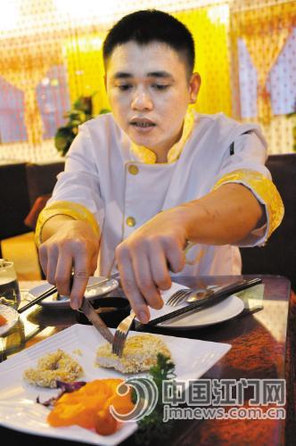接着端上来的是猪扒。经理说,扒类菜式要讲求新鲜爽口,不显韧,松脆,有肉质,才是上等扒。做猪扒要先将猪扒肉边缘的筋膜划断,避免煎时中间鼓起。再把肉拍松,在这小节上,李经理也与众不同,别人用刀背拍,他却以“扒锤”——专门拍打猪扒肉的木锤子,还是他改良过的。把肉拍到有了弹性,在肉的两面拍满干淀粉,然后在蛋清液里浸一下,再下料腌制。煎扒的时候,火候的掌握非常重要,他是煎几十秒,再夹起,待油稍降温,再炸,这样,味道以及火候才“入心”。