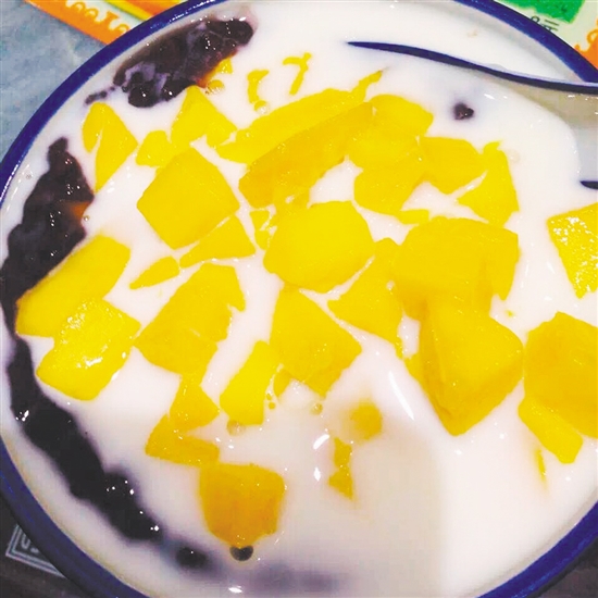 “最爱吃这里的芒果牛奶黑糯米了,黑糯米又香又糯,再配上牛奶,以及香甜的芒果,把它们搅拌均匀一起吃,甜甜的很有嚼头。”吃货阿琳说。“我们的黑糯米是经过自己加工处理的,口感比较特别。”欧阳先生说。