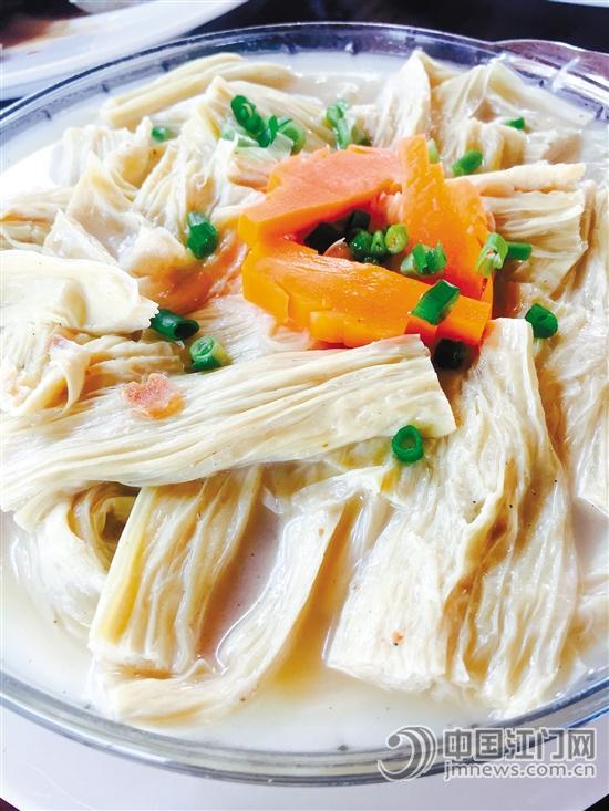 马耳山泉水清甜可口,加上腐竹本身含有十分浓郁的豆香味,因此做出来的这道清汤腐竹也滋味无穷。汤水成奶白色,喝起来鲜甜润滑,带有淡淡的豆香味,而腐竹绵滑可口,很适合老人家和小孩食用。