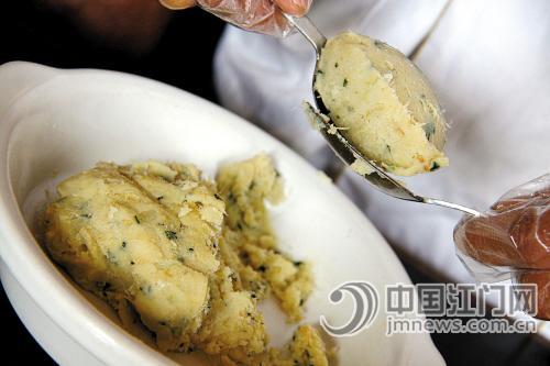 这是一款很有爱的小吃。马加休来自葡语Bacalhau,是葡萄牙鳕鱼经盐腌制但并不是风干保存而成,是葡国人最爱的咸鱼之一。大厨现场给我们做了一份马加休饼,只见“离心机”将鱼肉提取,加上上等薯蓉油炸而成,金黄诱人的马加休饼,咬一口,满嘴脆香,外脆肉松软,入口溶化,完全不觉得油腻。笔者现场偷师,学了制作技巧,有模有样地翻动勺子,但怎么做也没做出大厨的风范,哎,“功力不足”啊!