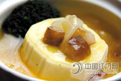 豆腐本是一种普通食材,但“同乐”则巧用这一“平凡”的食材做出不平凡的地道招牌菜。“一品豆腐原是一道鲁式官府菜,以鲜嫩爽滑、低脂健康、老少咸宜为特点。要把一品豆腐做得嫩滑香甜不腻喉,需要一些技巧。传统的做法相对复杂,我们则独创了一套‘独门秘方’,让食客一试难忘。”强哥说。众所周知,“同乐”对鲍参翅肚的烹饪很有心得,其秘制鲍汁得到食客的一致认可。用鲍汁、花胶、海参配以高汤熬制这香嫩软滑的豆腐,刚到舌尖,豆腐则缓缓融化,不用咀嚼,早已消失得无影无踪。豆制品本身的香气并没有掩盖,合上嘴巴,鲍参的香味、豆香、鸡蛋的鲜香分层释放,妙哉!