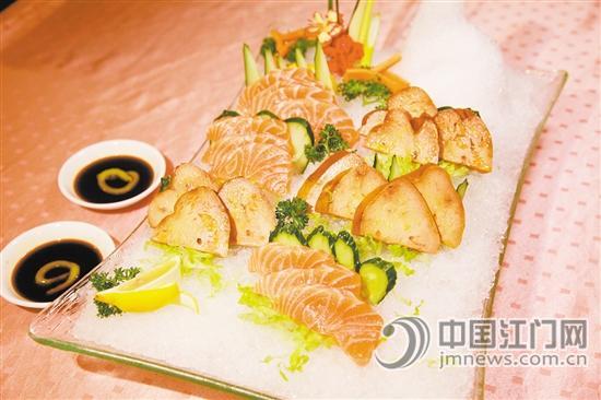 日式鹅肝拼三文鱼:看到这道菜还以来到了西餐厅,厚厚的沙冰上面摆放了肥美的三文鱼和用日本清酒煮过的鹅肝,再配上一块柠檬,光看样子就让人垂涎欲滴。鹅肝味重、香滑,吃完后鹅肝的香味在口腔内迟迟不散去。此时最好先喝口茶,冲淡鹅肝的味道,休息一下再吃其他菜,否则会品不出其他菜的美味。三文鱼细嫩、肥而不腻。