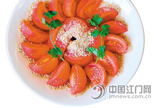 清甜的番茄遇上九制陈皮的独特味道,碰撞出前所未有的火花。番茄清爽多汁,甘咸而清香的陈皮与其一拍即合。让人吃得停不了口。不需盐、糖、油,却能创造出意想不到的美味。据周洁波介绍,这道菜要用开水烫番茄4秒钟左右,令其外皮破裂,再切小块隔水蒸10分钟,撒上切碎的九制陈皮即可。做法相对简单,若冰镇一下,则有另一番风味。