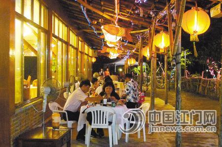 一天傍晚,我们沿着古兜河,来到一条钢木结构的小桥。桥头处竖着一个木牌坊,上书三个字:“观潮桥”。小桥旁边还竖有一个介绍牌,称该桥位于河海交汇处,南通南海,北连东方红水库,从桥上即可观潮起潮落之胜景。餐厅内,除挂了一盏盏灯笼外,还挂有充满喜庆色彩的鱼灯。“这是新会鱼灯,是由新会民间艺人制的,我们特意从会城买回来的。”古兜温泉农庄经理钟星启说。
