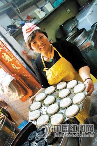 光是蓬江区胜利市场,就有五六家制作艾糍的小店,其中最为有名的一家是在“五味鹅”旁边的“肥妹饺子”,店铺不大,大约20平方米,但里头是人丁兴旺。大人小孩,人手是相当充足的,开炉时间一到,只见七八个老人家纷纷而至。“我在这里吃了13年的艾糍,味道依然那么正宗。七八元一斤,不贵。重点是里头货真价实,老板娘特制的大号艾糍,我家孙子最喜欢吃了!”老婆婆笑着对笔者说。