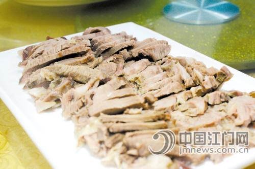 我们入座之后,笔者的一位朋友也是“吃货”,他叫来一名服务员,特别点了这家餐厅的几道招牌菜,其中包括脆皮烧鹅和卤水拼盘。说实话,虽然和记餐厅在江门来说很有名气,但之前笔者并没有帮衬过这家餐厅。“烧鹅来了。”入座不久,服务员为我们端上一盘烧鹅,烧鹅刚上桌,其散发出来的浓郁肉香味,已令人垂涎欲滴,食指大动。看见这道还泛着油光的烧鹅,笔者一下子忘记了自己的仪态,抢先夹了一块烧鹅放入口中吃了起来,发觉鹅皮酥脆、鹅肉嫩滑,肥而不腻,十分不错。用来配合烧鹅的酱料香味浓郁,拌在饭里,味香色靓,让人忍不住多吃几口。