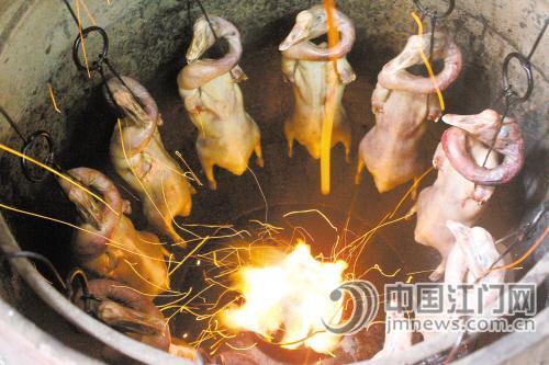 一、火:高温烘烤,使鹅鼓胀,避免了因碌水而损伤鹅皮。