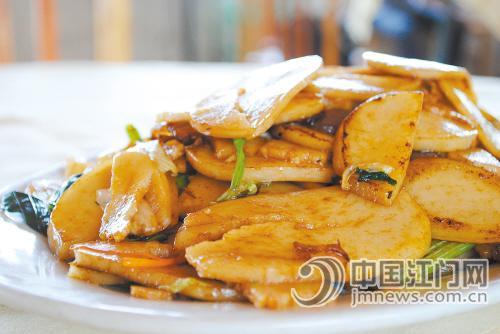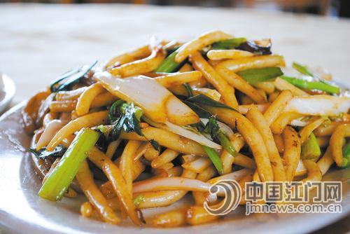 炒糍必就是用做好的糍必做原料,配上肉丝和青菜等佐料,炒过以后,油滑爽口,味道独特。