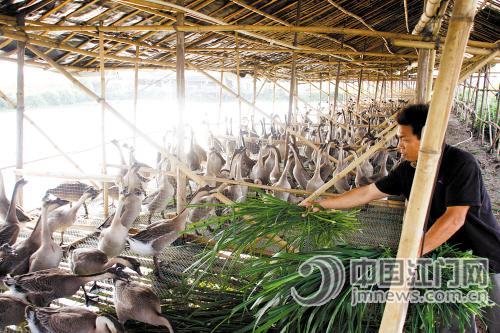 鹏一农庄老板冉总告诉笔者,烧鹅美味,除了制作技巧讲究外,归根到底“鹅”要好。“现在市面上卖的鹅肉,大多偏肥,肉也不结实,做家常菜都不大好吃,更别说烧鹅了。”面对笔者的疑惑,冉总说:“我们选用的鹅种是广东四大名鹅——开平马冈鹅。此外,我们的鹅住的可是‘五星级的家’,主人服务到位,每天坚持锻炼,重要的是饮食健康。”这样一番幽默的解释,勾起了笔者的好奇心,我决定到鹅场一睹其风采。