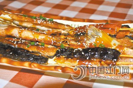 乍一看,三文鱼串烧做得有点像羊肉串。拿起一串三文鱼串烧咬了一口,觉得另有风味,三文鱼显得很甘香。“牙缝里也能透出三文鱼的香味!”笔者对潘绍忠说。