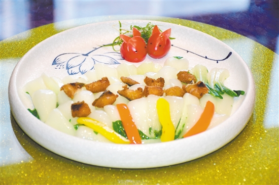 还有一道是咸鱼粒炒白菜仔,一个简单的家常菜里面可有很大文章。“秋冬时节,天气干燥,特别容易上火,以前老人家就知道一个小秘方,如果牙痛,可以拿咸鱼头加上豆腐芫荽煲汤喝,特别有效。”莫大厨告诉记者,这道咸鱼粒炒白菜仔也有此效果。