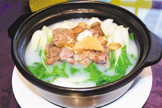 先是上来一道咸猪骨煲白菜仔,翠绿翠绿的白菜让人食指大动,上面铺上几块咸猪骨,原来咸猪骨可以去火,吃完白菜还可以把汤也喝完。“熬夜过多,压力大,或男士抽烟过多,吃这个最好。”莫大厨对自己厨艺信心满满。