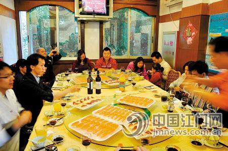可能是北极贝刺身和三文鱼刺身太好吃的缘故,这两道菜肴都是一上桌,就被团友们很快吃到盘中见底。倒是李老板很豪爽,接二连三为团友们添加北极贝刺身和三文鱼刺身,而且还配有法国红酒,让团友们开心不已。 (文/图 伍启达)