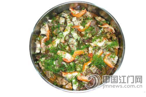圆盆一品鲜,是将山坑鱼、走地鸡、新鲜排骨与虾等,加入姜、葱、蒜等调料在圆盆里同焖。