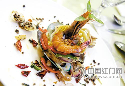 之所以喜欢这里的菜式,更在于这里大厨的新意。大厨把意大利的菜式用欧式做法烹调,并适当本土化,以迎合五邑人的口味。大厨选用纽西兰青口、鲜鱿、白贝、大虾、鳕鱼,用胡椒提鲜,每一口海鲜都散发着胡椒的辣香,但辣劲只留在舌尖,这较为重口味的菜式是不少北方人的挚爱。