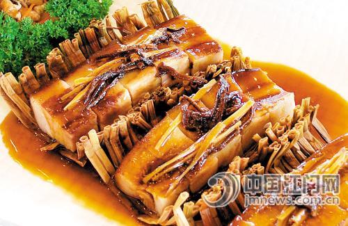 稻穗卷金猪。挑选有“五层楼”的五花腩肉,一般一只猪只有8-10斤,切成条状,用禾秆草扎好,放入有调味料的瓦煲中煲半小时。虽然看起来有很多肥肉,但脂肪已被禾秆草吸收。吃时,淋上秘制酱汁,送入嘴里,肥肉入口即化,软绵甘香,连猪皮也软糯香口,肥肉融化后,瘦肉很入味,越吃越香。